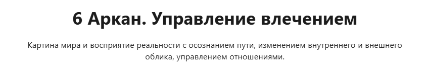 «6 Аркан — способность управлять вектором притяжения. Это работа с картиной мира и восприятием реальности, с осознанием собственного пути и созданием будущего...
